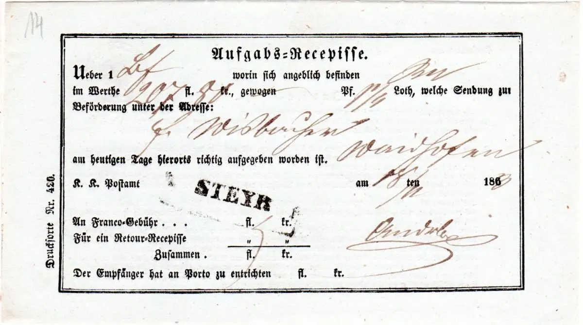 Österreich 1863, L1 Steyr klar auf Aufgabs-Recepisse, gut erhaltener Postschein