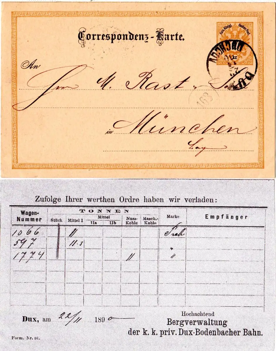 Ganzsache v. Dux n. Bayern m. rs. Zudruck der Bergverwaltung der k.k. priv. Dux-Bodenbacher Bahn.
