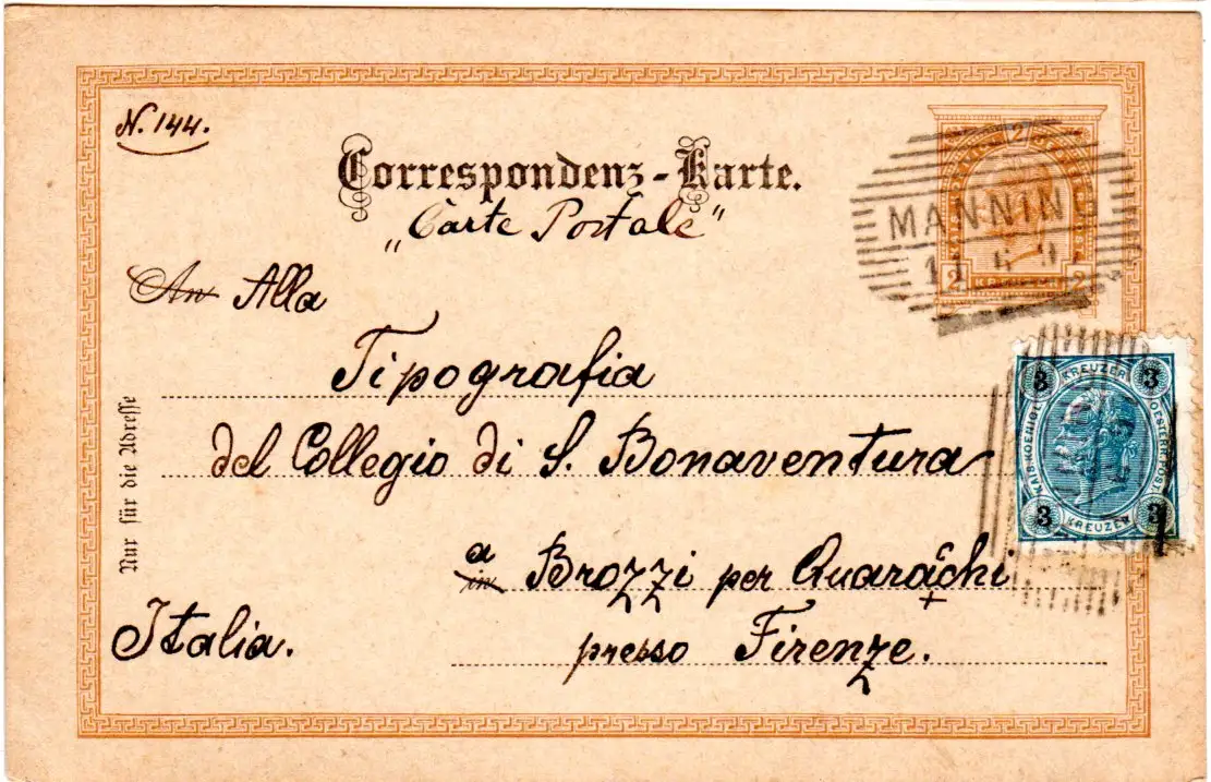 Österreich 1897, 3Kr. Zusatzfr. auf 2 Kr. Ganzsache v. Manning n. Italien