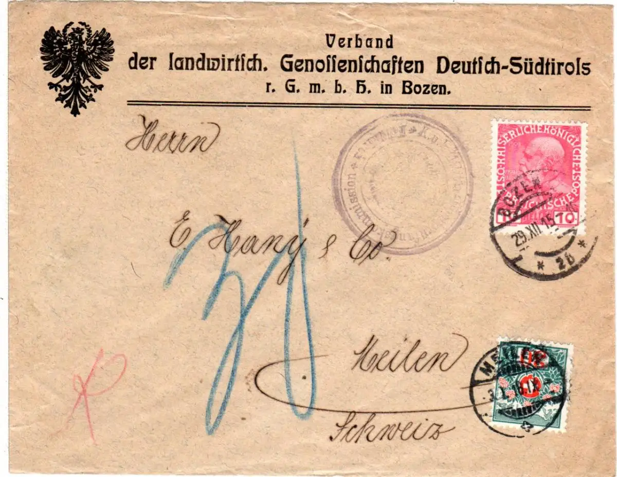 Österreich 1915, 10 H. auf Firmenbrief v. Bozen m. 10 C. Schweiz Portomarke.