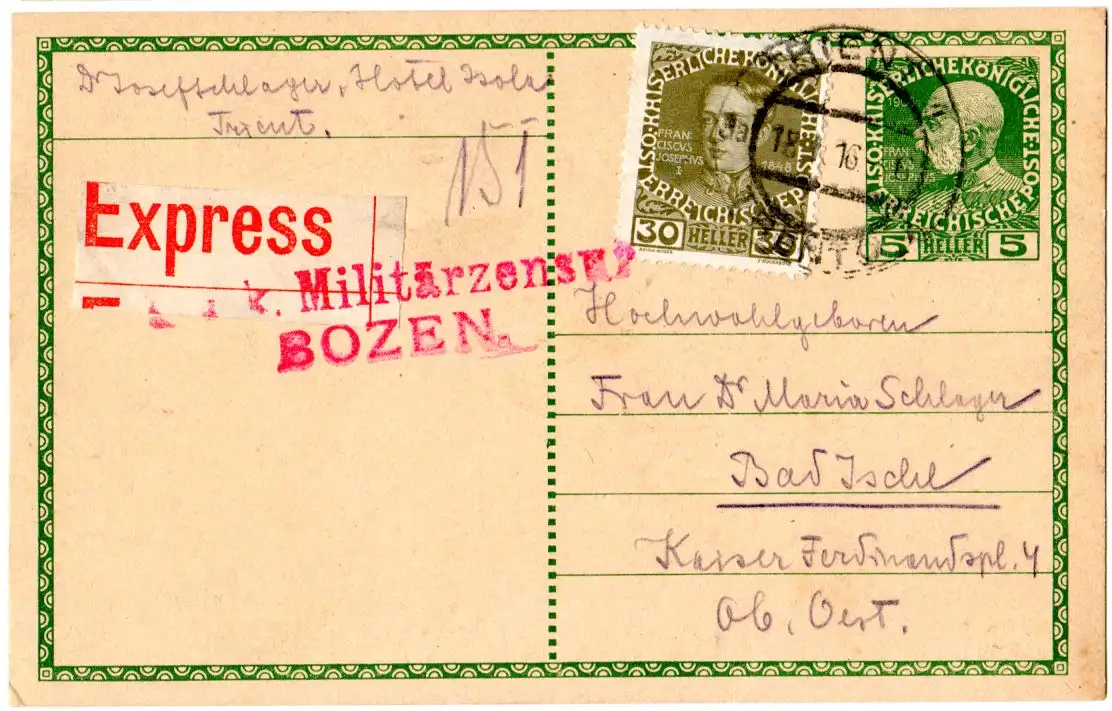 Österreich 1916, 30 H. auf 5 H. Express Ganzsache v. Trient m. Bozen Zensur