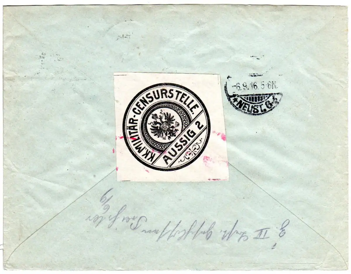 Österreich 1916, 5+2x20 H. auf Einschreiben Brief v. Bünauburg m. Aussig Zensur