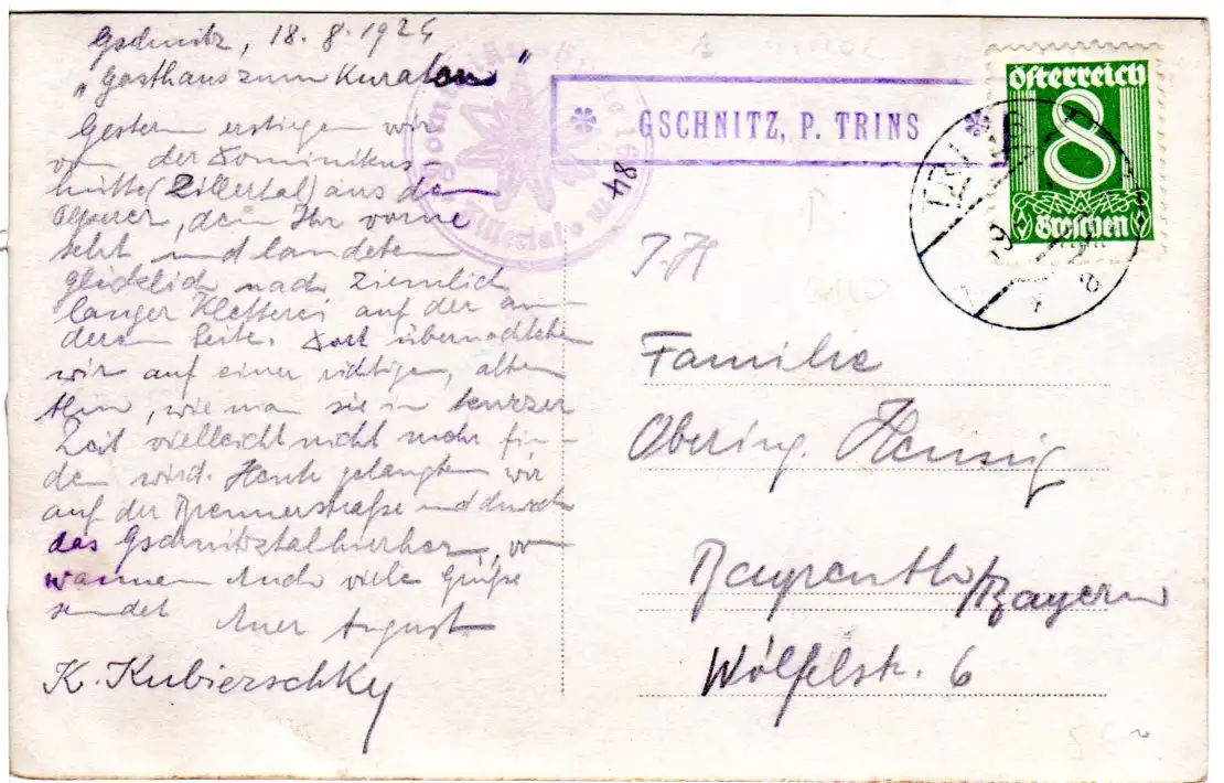 Österreich 1929, Posthilfstellen-R1 GSCHNITZ, P. TRINS auf Karte m. 8 Gr.