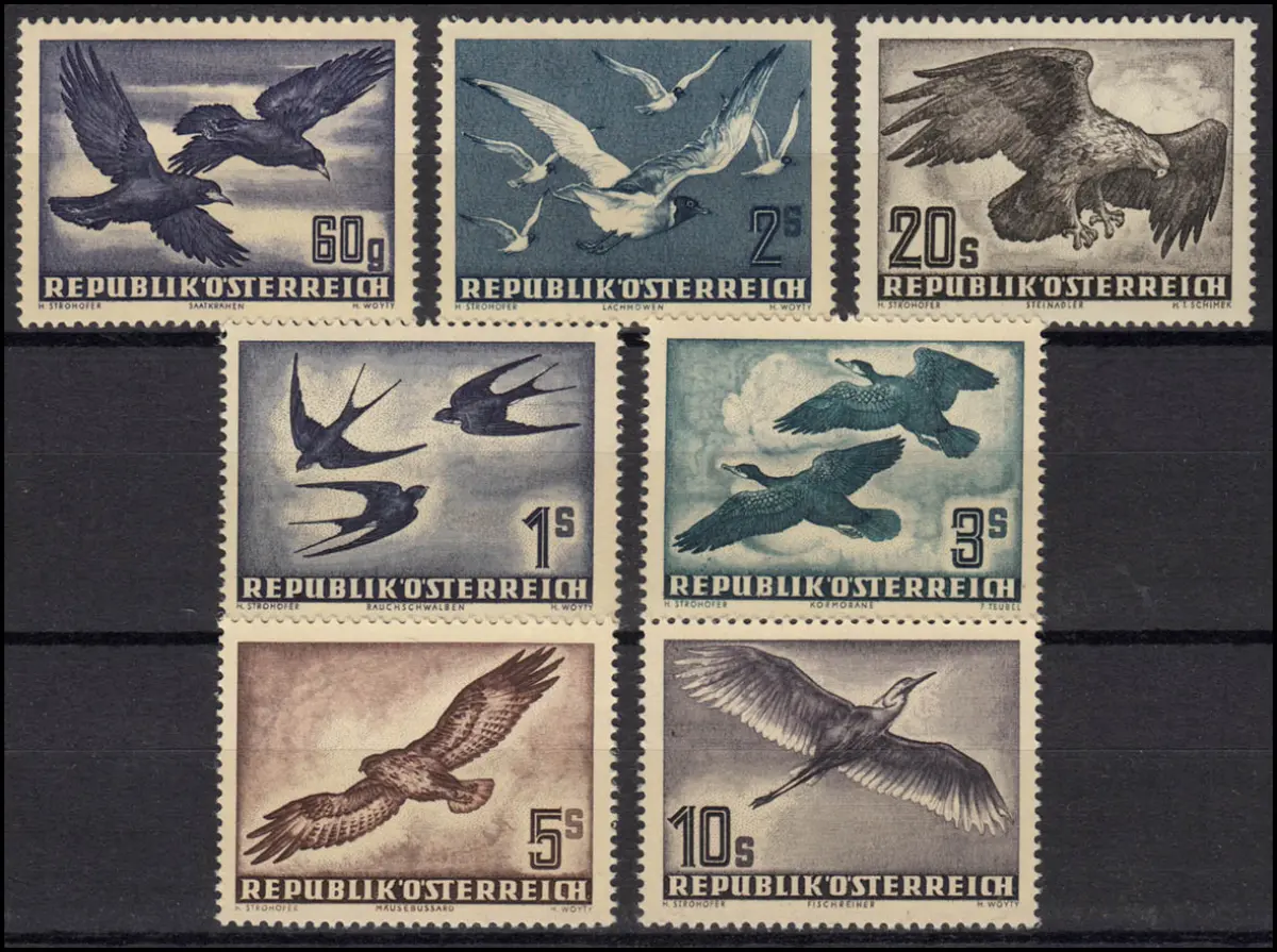 Österreich 955ff Flugpostmarken Vögel, 7 Werte komplett, alle postfrisch **