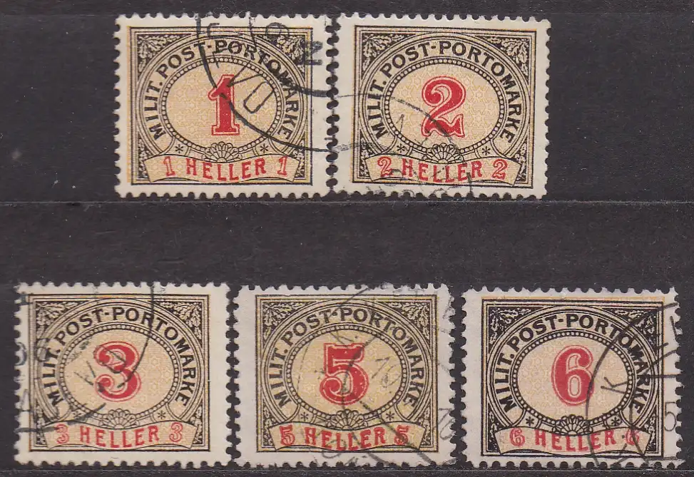Österreich - Bosnien und Herzegowina, Portomarken Mi-Nr. 1, 2, 3, 5 + 6 gest., Ziffernzeichnung