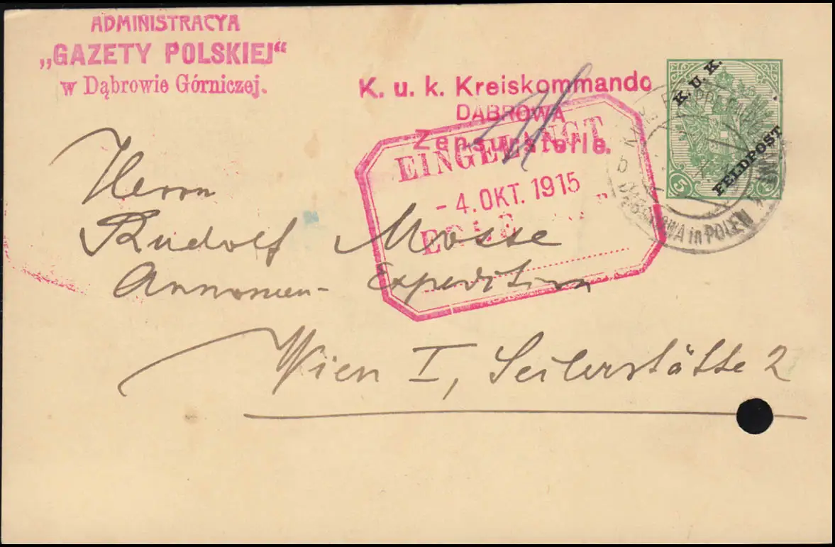 Österreichisch-ungarische Feldpost / K.u.K. (Kaiserliche und Königliche) Feldpost, roter Briefstempel "K.u.K. Kreiskommando Dabrowa" nach Wien / Eingangsstempel 4.10.1915, Aktenlochung