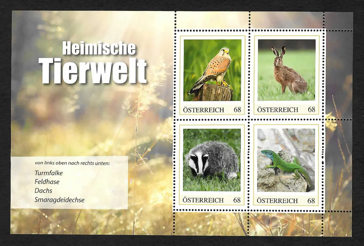 Österreich: Heimische Tierwelt: Turmfalke, Feldhase, Dachs, Eidechse, postfrisch