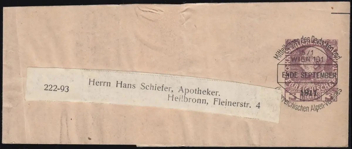 Vorausentwertung "Mitteilungen des Deutschen und Österreichischen Alpen-Vereins - 15/1 WIEN 101 - ENDE SEPTEMBER 1911", gelaufen nach Heilbraonn / Deutschland