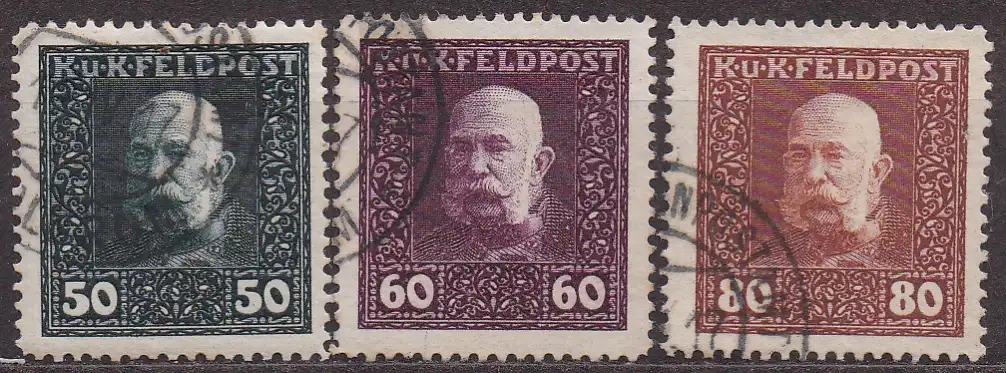 Österreich - österr.-ung. Feldpost, Mi-Nr. 38, 39 + 41 gest., Kaiser Franz Joseph