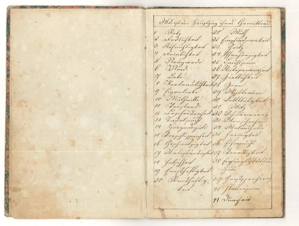 o. O. [2. Hälfte 19. Jahrhundert]. Deutsche Handschrift in brauner Tinte auf Papier. 8°. 22 S., 1 w. Bl. Pbd. mit Marmorpapierbezug und geprägtem Deckelschildchen. Einband berieben, etwas gebräunt und stockfleckig.