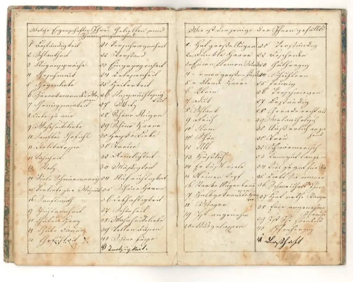 Bemerkungen: Handschriftliches Buch mit Fragen, wohl für eine okkulte Séance. Das Deckelschildchen trägt den Titel " Orakel von Menphis". Es enthält 21 Fragen wie etwa: "Was ist der Hauptzug ihres Charakters?", "Sind Sie verliebt?", "Was ist Ihr Geliebter?", "Was verdient Ihr Geliebter?" oder "Wodurch werden Sie Ihr Glück machen?". Auf die Fragen folgen jeweils 40 Antwortmöglichkeiten, einen 41. ist von anderer Hand jeweils am Schluss dazu notiert worden.