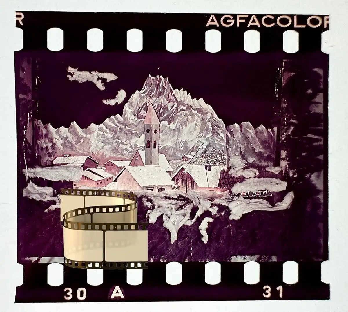 Orig. Farbdia Agfacolor - gemaltes Dorf mit Kirche Winterlandschaft in den AlpenMaße 4 x 3,5 cm