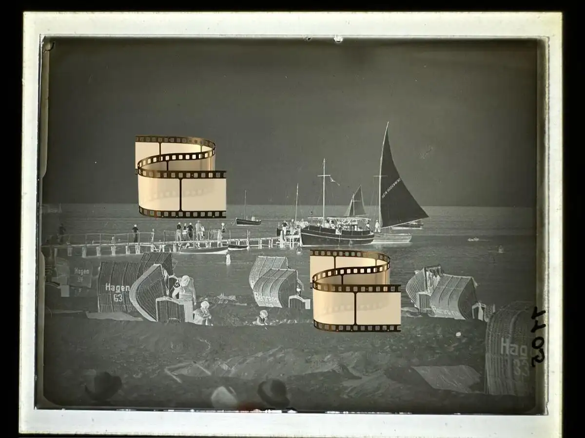 Orig Fotoplatte Glas 1937 Strandkörbe Segelboote Brücke uvm Grömitz Kiel 12x9 cm