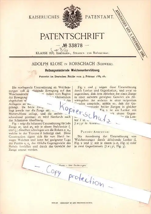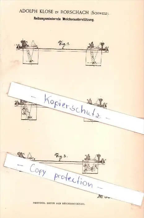 Original Patent - A. Klose in Rorschach , Schweiz , 1885 , Reibungsmindernde Weichen , Eisenbahn !!!