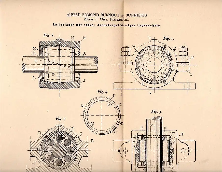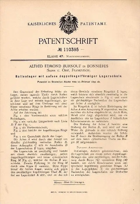 Original Patent - A.E. Burnouf dans Bonnieres-sur-Seine , 1899 , Les roulements à rouleaux à double coque de palier !!!