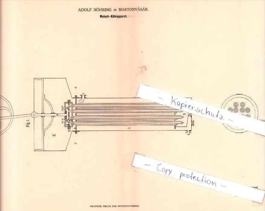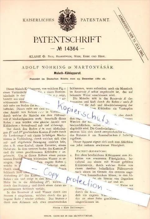 Original Patent - Adolf Nöhring in Martonvasar , 1880 , Maische-Kühlapparat , Brauerei , Alkohol , Martinsmarkt !!!