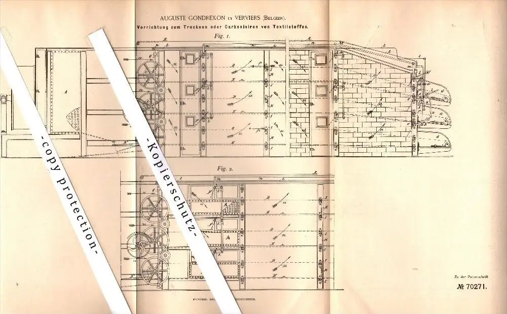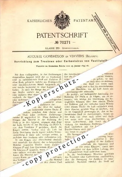 Original Patent - Auguste Gondrexon in Verviers , Belgien , 1893 , Apparat zum Trocknen von Textilien !!!