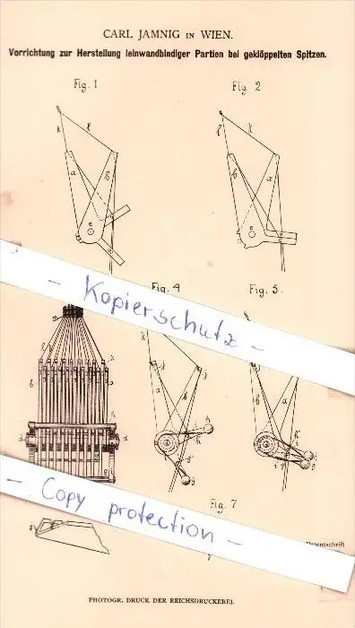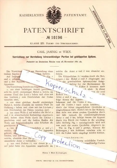 Original Patent - C. Jamnig in Wien , 1881 , Herstellung leinwandbindiger Partien bei Spitzen !!!