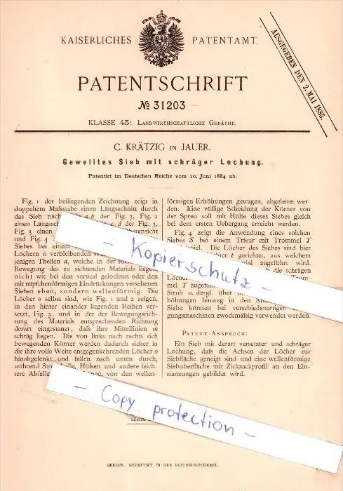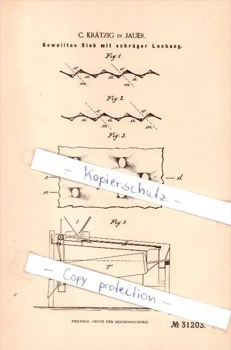 Original Patent - C. Krätzig in Jauer , 1884 , Gewelltes Sieb mit schräger Lochung !!!