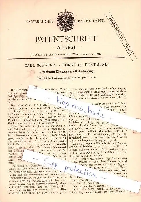 Original Patent - C. Schäfer in Cörne bei Dortmund , 1881 , Braupfannen-Einmauerung !!!