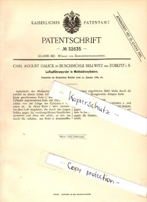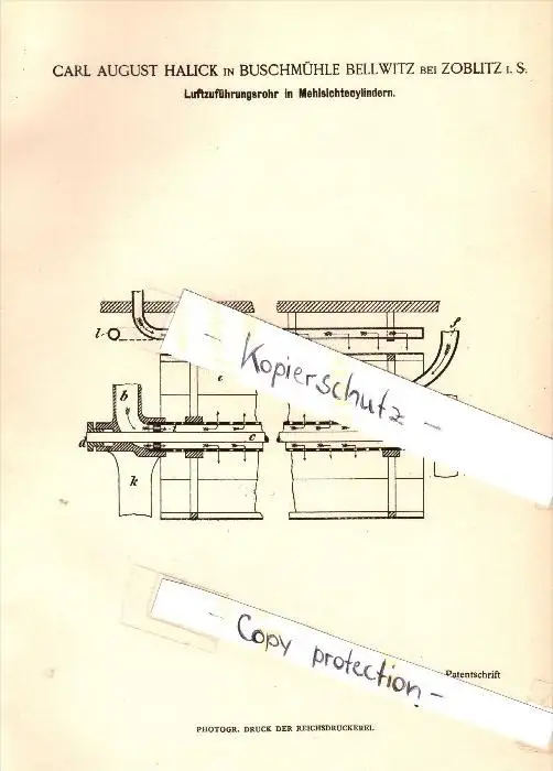 Original Patent - C.A. Halick in Buschmühle Bellwitz b. Zoblitz / Reichenbach i.S. ,1885 ,Sichtecylinder , Mühle , Löbau