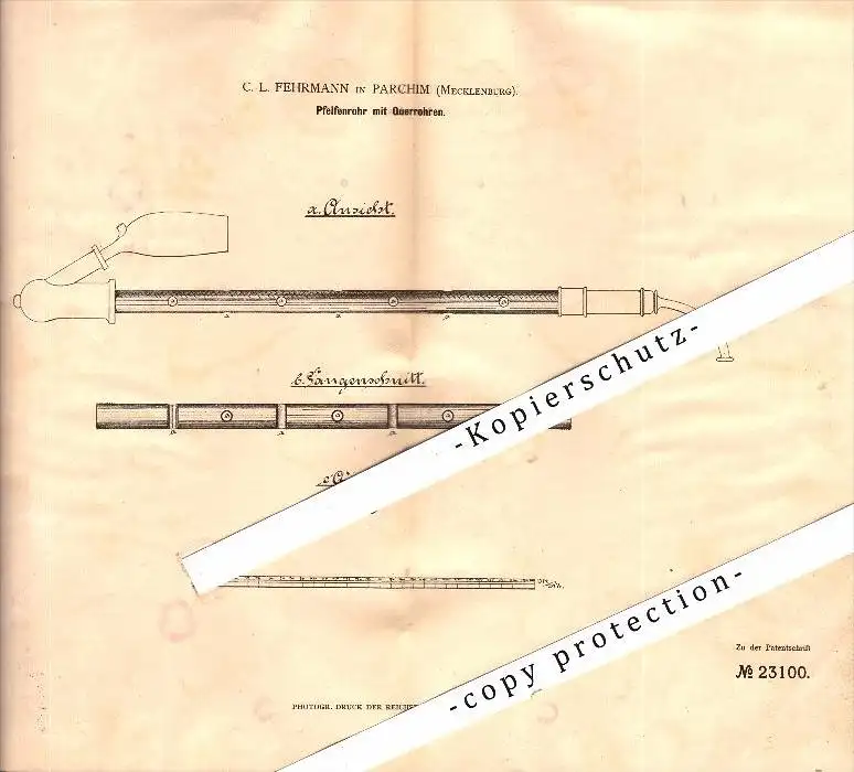 Original Patent - C.L. Fehrmann in Parchim i. Mecklenburg , 1883 , Pfeifenrohr mit Querrohren , Pfeife , Tabak !!!