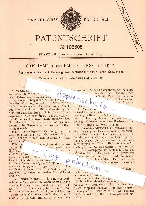 Original Patent - Carl Imme jr. und Paul Pitlinski in Berlin , 1898 , Acetylenentwickler !!!