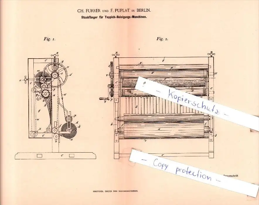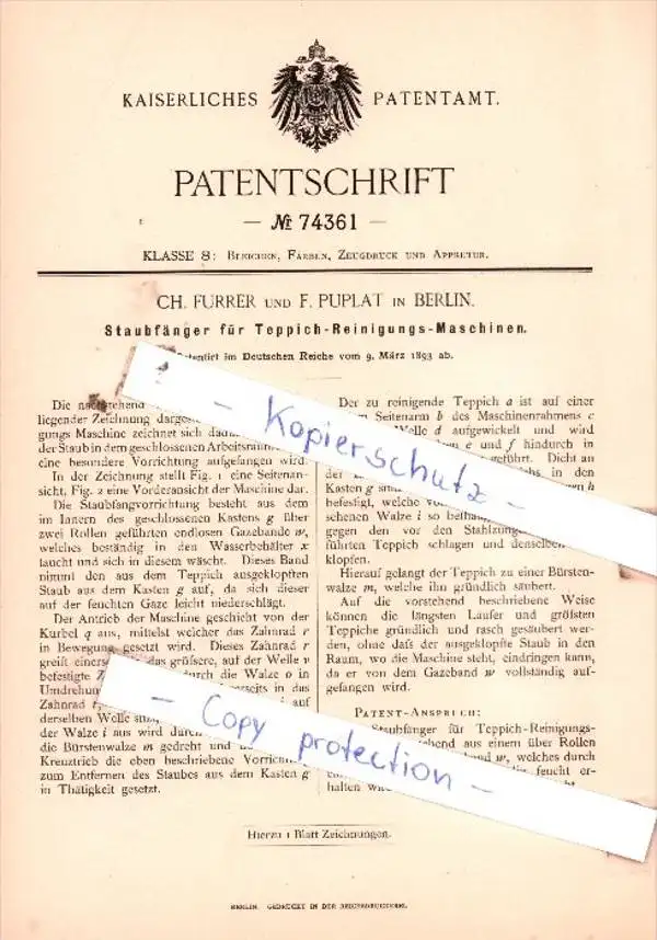 Original Patent - Ch. Furrer und F. Puplat in Berlin , 1893 , Staubfänger für Teppich-Reinigungs-Maschinen !!!