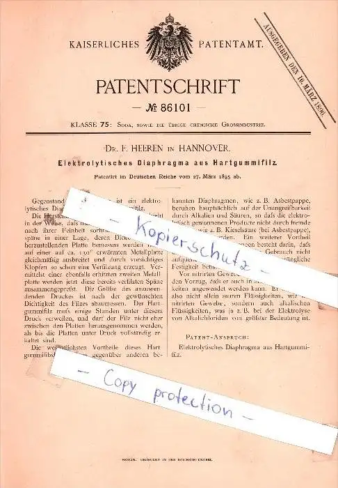 Original Patent - Dr. F. Heeren in Hannover , 1895 , Elektrolytisches Diaphragma !!!