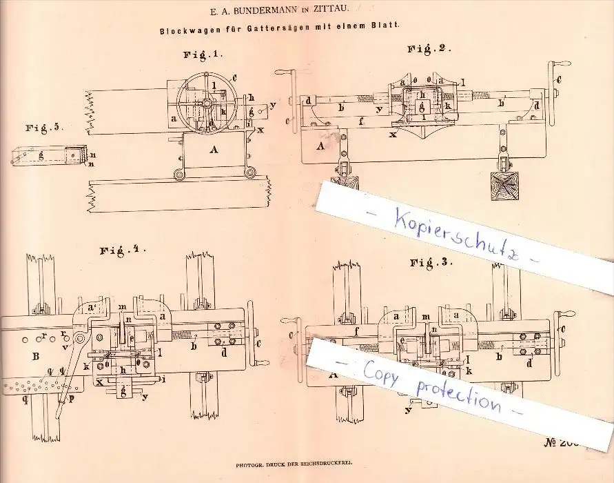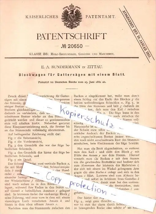 Original Patent - E. A. Bundermann in Zittau , 1882 , Blockwagen für Gattersägen , Sägewerk !!!