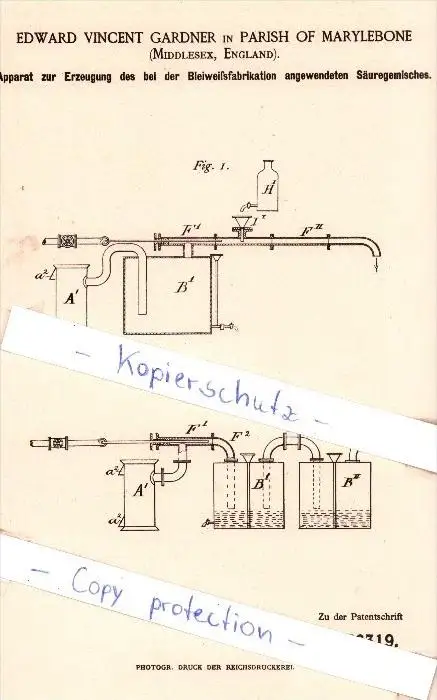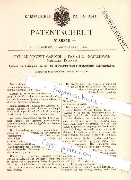 Original Patent - E. V. Gardner in Parish of Marylebone n. London , 1885 , white lead factory !!!