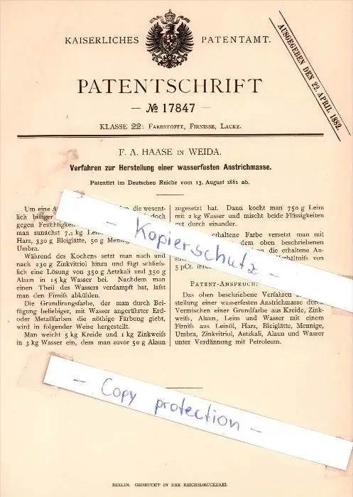 Original Patent - F. A. Haase in Weida , 1881 , Herstellung einer wasserfesten Anstrichmasse !!!