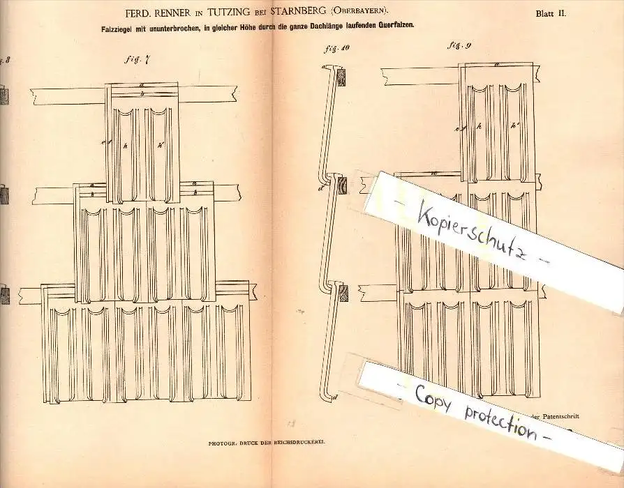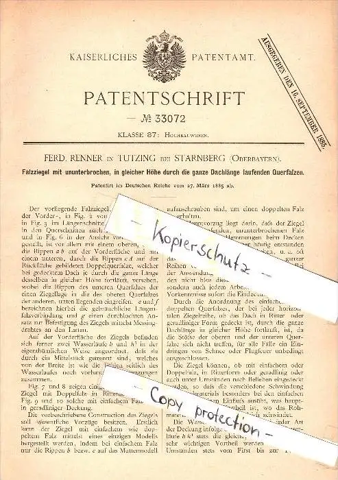 Original Patent - F. Renner in Tutzing b. Starnberg , 1885 , Falzziegel , Dach , Dachdecker , Ziegel , Bau !!!