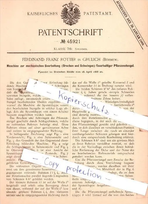 Original Patent - Ferdinand Franz Rotter in Grulich / Králiky , Böhmen , 1888 , Spinnerei !!!