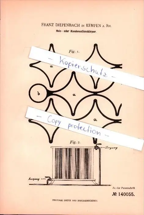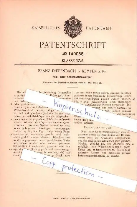 Original Patent - Franz Diepenbach in Kempen , 1902 , Heiz- oder Kondensationskörper!!!