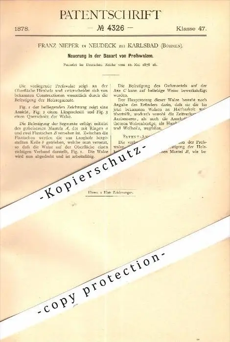 Original Patent - Franz Nieper in Neudeck / Nejdek b. Karlsbad / Karlovy Vary , 1878 , Presswalze !!!