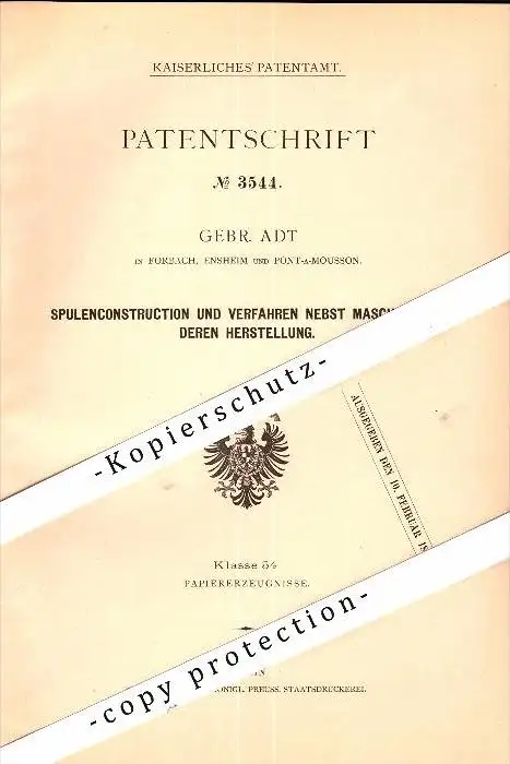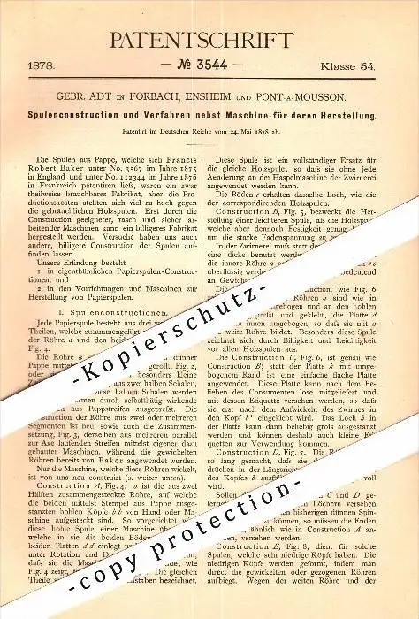 Original Patent - G. Adt à Forbach , Ensheim et Pont-à-Mousson , 1878 , Machine pour usine de papier !!!