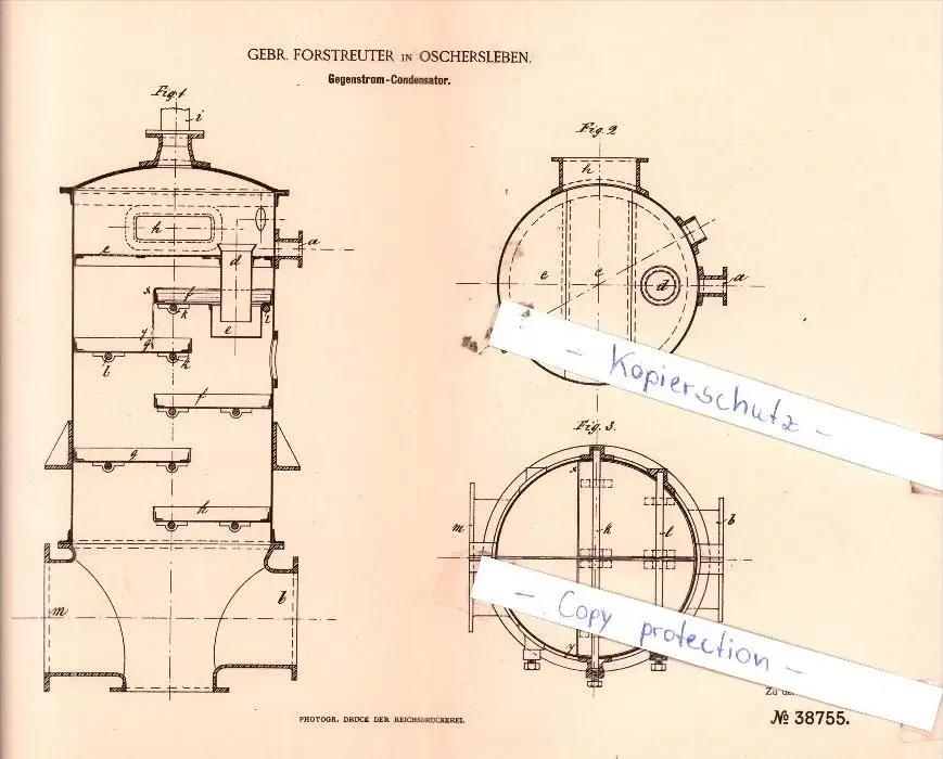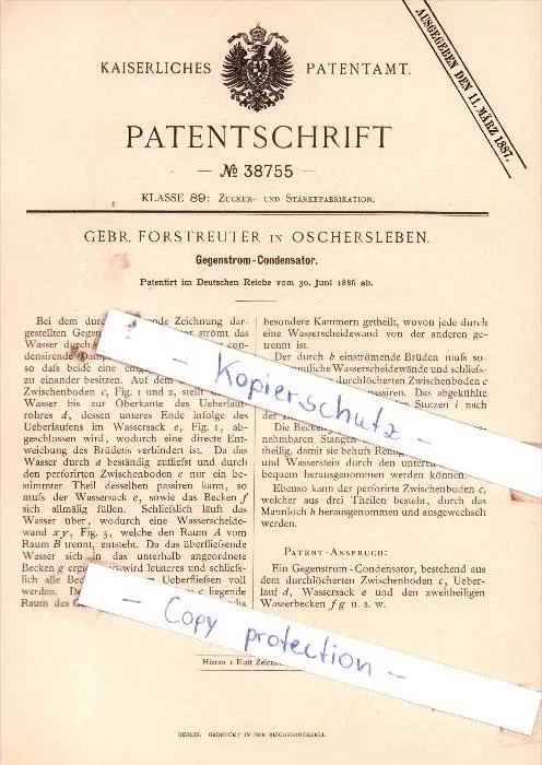 Original Patent - Gebr. Forstreuter in Oschersleben , 1886 , Gegenstrom-Condensator !!!