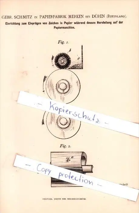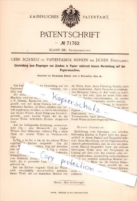 Original Patent - Gebr. Schmitz in Merken bei Düren , Rheinland , 1892 , Papierfabrikation , Papierfabrik !!!