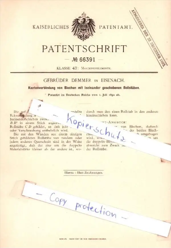 Original Patent - Gebrüder Demmer in Eisenach 1892 , Maschinenelemente !!!