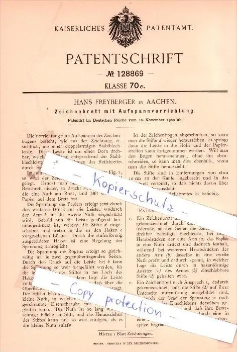 Original Patent - Hans Freyberger in Aachen , 1900 , Zeichenbrett mit Aufspannvorrichtung !!!