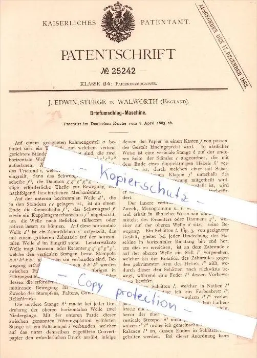Original Patent - J. Edwin Sturge in Walworth , England , 1883 , Envelope machine , London !!!