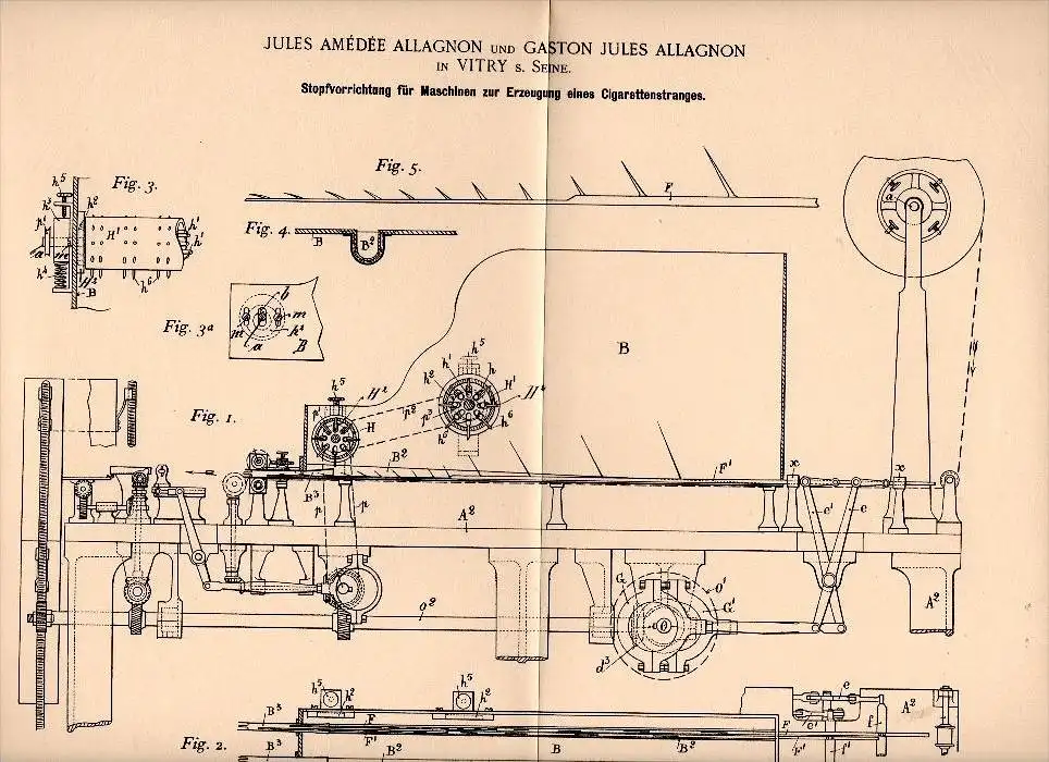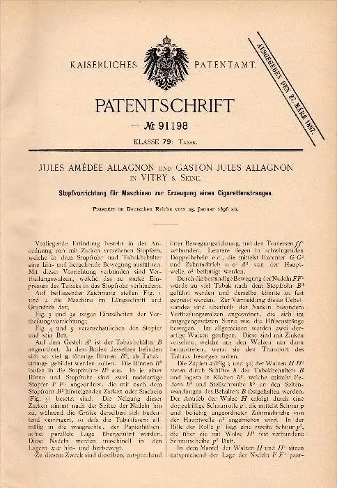 Original Patent - J.A. Allagnon dans Vitry sur Seine , 1896 , Appareil pour la fabrication de cigarettes , de tabac !!!