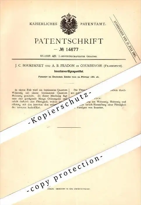 Original Patent - J.C. Bourdenet et A. Pradon à Courbevoie , 1881 , Destruction of insects !!!