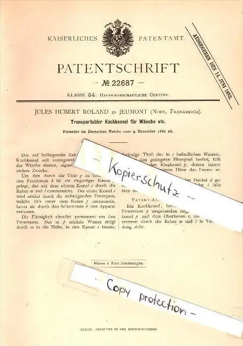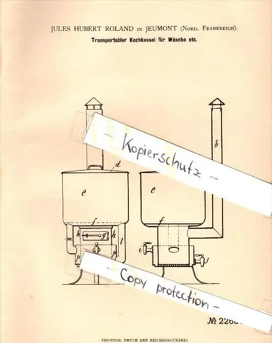 Original Patent - J.H. Roland à Jeumont , Nord , 1882 , bouilloire cuisson portatif pour la lessive !!