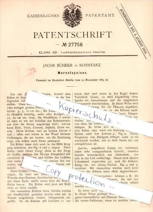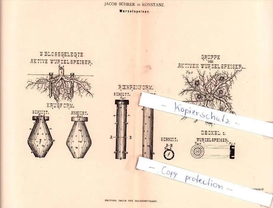 Original Patent - Jacob Bührer in Konstanz , 1883 , Wurzelspeiser !!!