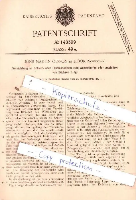 Original Patent - Jöns Martin Olsson in Höör , Schweden , 1903 , Schleif- oder Fräsmaschinen !!!