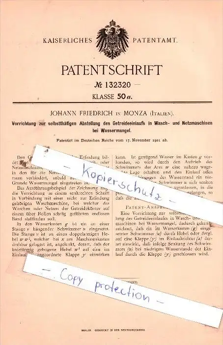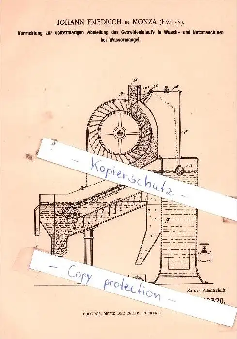 Original Patent - Johann Friedrich in Monza , Italien , 1901 , Abstellung des Getreideeinlaufs !!!