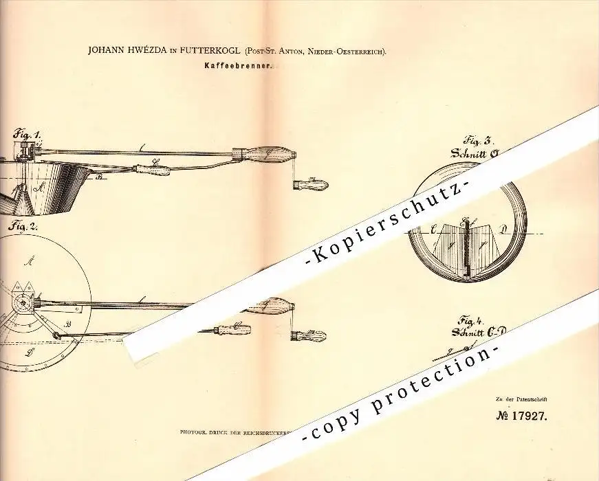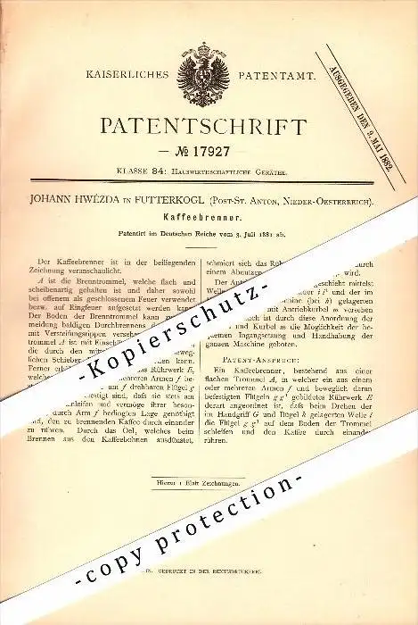 Original Patent - Johann Hwézda in Futterkogl b. St. Anton an der Jeßnitz , 1881 , Kaffeebrenner , Kaffee , Sankt Anton