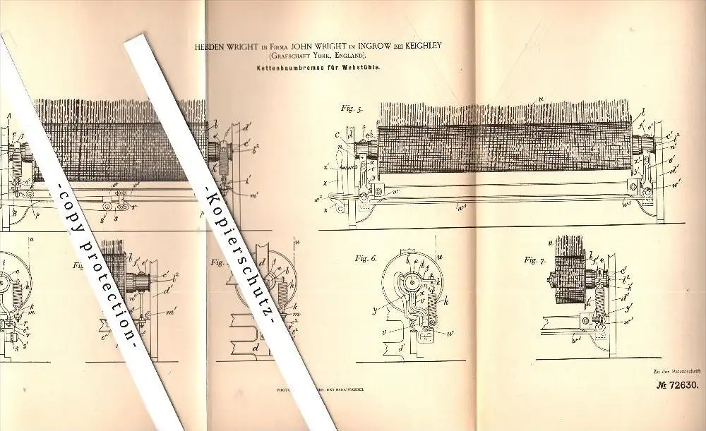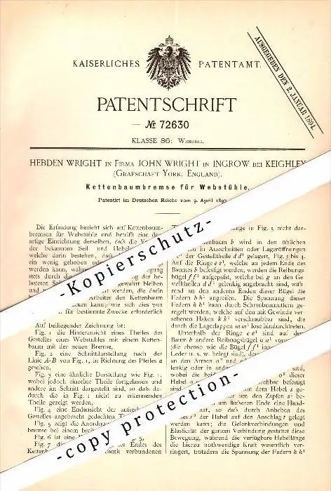 Original Patent - John Wright in Ingrow b. Keighley , Yorkshire , 1893 , Brake for loom , weaving !!!